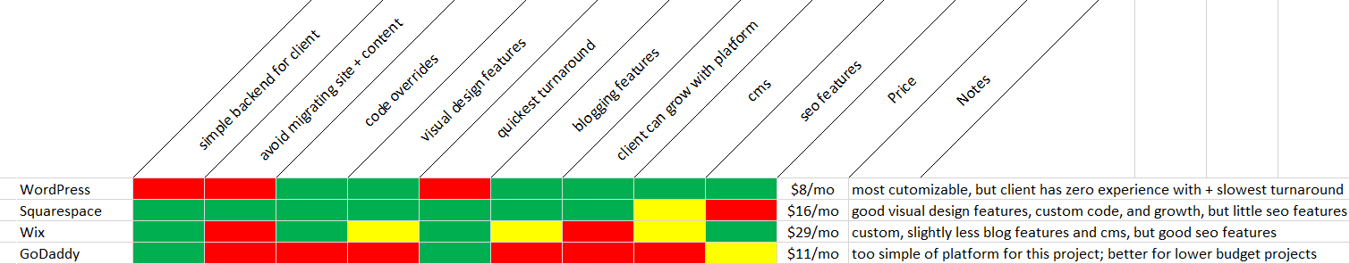 When choosing a platform that best fit the needs of my client and end users, I had to take a few things into consideration. I wanted the client to able to navigate the backend with little friction, but I needed a platform that would allow me to inject custom code into the website. The spreadsheet below represents the research I conducted to determine which platform to build and host the website on.